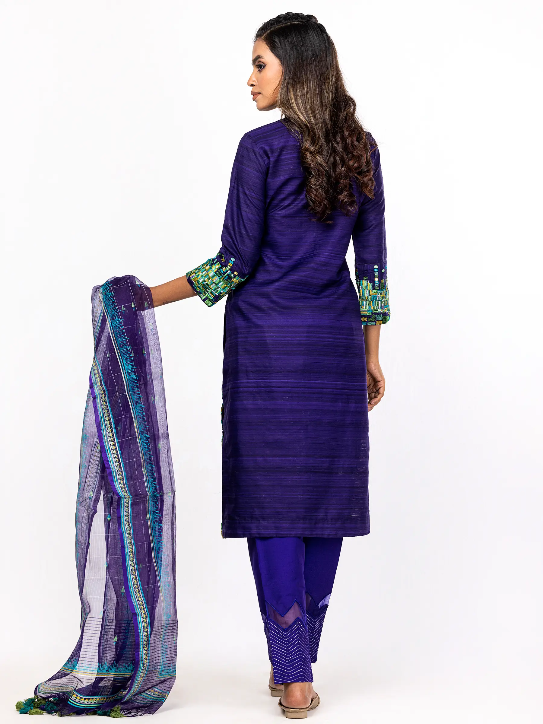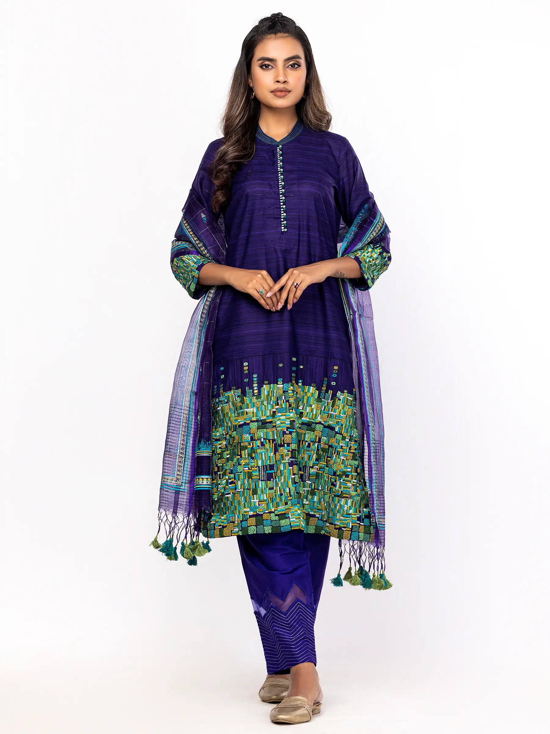 Navy blue endi silk kameez with shades of blue, green and brown embroidery. Comes with blue joysree silk shalwar and matching printed muslin silk dupatta with tassels.