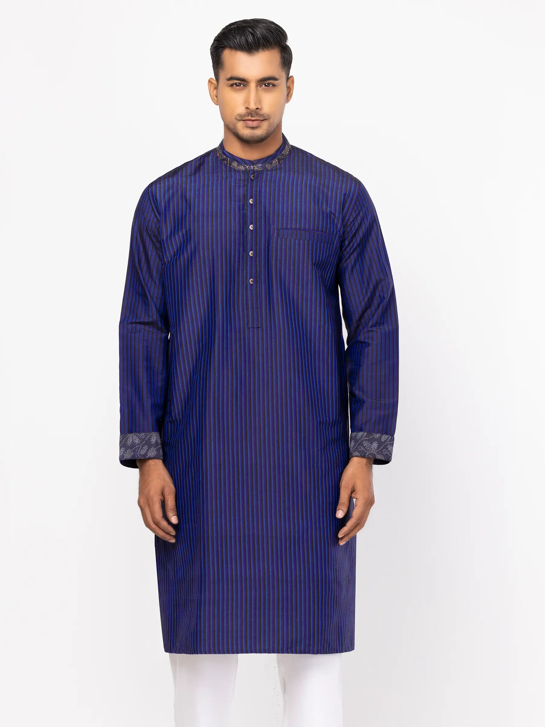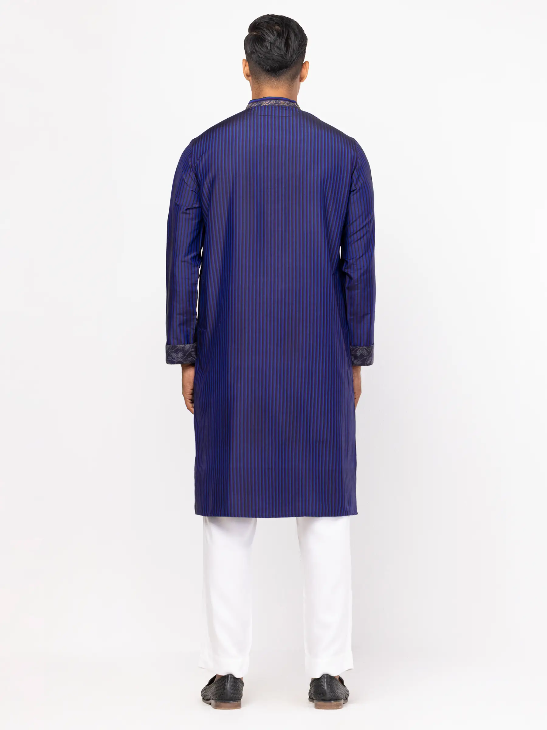 Blue striped joysree silk panjabi with brown embroidery. Features in-seam side pockets.
